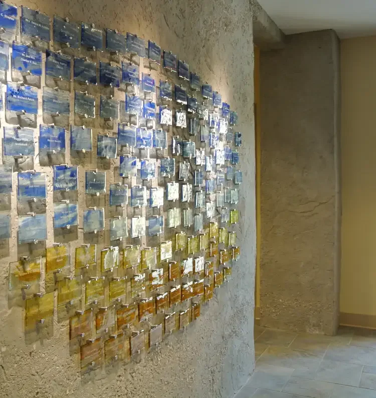 How do we bring the calming nature of water into the space? That was the question Laurie Taylor, VP of Development for Lower Cape Fear LifeCare, asked when envisioning a donor recognition wall for their facility in Bolivia, North Carolina, a quiet coastal town surrounded by tidal rivers, salt marshes, and the wide expanse of the Cape Fear region. Our glass design was the answer. We created a flowing composition inspired by the natural beauty that defines the area. Deep blues reflect the endless Carolina sky and nearby waters, while shimmering gold evokes the sunlit sands of the coast. Each kiln-formed glass tile is hand-painted, with donor names delicately etched into the surface.